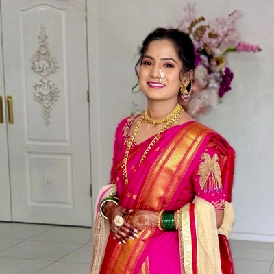 Sneha was extremely happy with the final look and the overall service. Her happiness and appreciation truly reflected the effort put into every detail, from hair and saree draping to achieving a complete traditional Maharashtrian bridal look with a soft, natural glam touch.