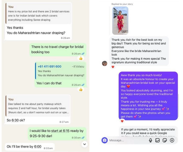 Once the makeup was completed, Ash personally followed up with Sneha to confirm she was satisfied with the final look. Her positive response highlighted the quality, care, and professionalism maintained throughout the service.